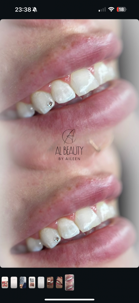 Schmuckstücke (Steine, Silikon- oder Metallanhänger, die an den Zähnen befestigt werden. Beliebt als individuelles Stilmittel.